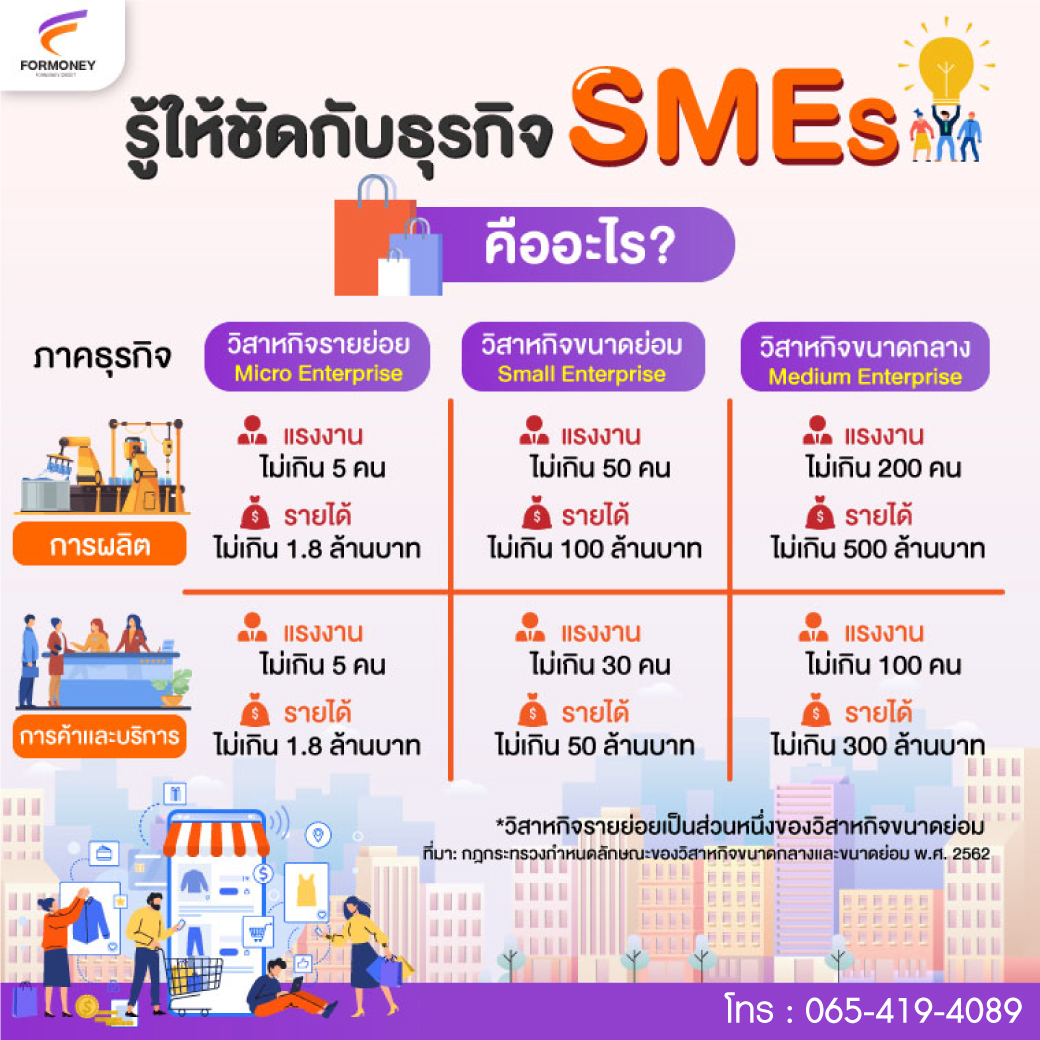 ธุรกิจ SMEs เป็นองค์กรที่มีส่วนสำคัญในการพัฒนาประเทศทั้งทางด้านเศรษฐกิจและสังคม โดย SMEs ย่อมาจากคำว่า Small and Medium Enterprises หมายถึง ธุรกิจขนาดกลางและขนาดย่อม  ประกอบไปด้วย คณะบุคคล บุคคลธรรมดา ห้างหุ้นส่วนจำกัด โดยประเภทของ SME จะครอบคลุมกิจการหลัก 3 กิจการ ได้แก่